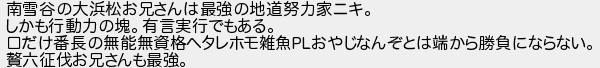 南雪谷の大浜松お兄さんは最強の地道努力家ニキ しかも行動力の塊有言実行でもある 口だけ番長の無能無資格ヘタレホモ雑魚おやじなんぞとは端から勝負にならない 六征伐お兄さんも最強