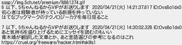 36: [sage] 2020/04/21(火) 14:40:14.46 ID:+f27AOd7 sssp://img.5ch.net/premium/8881374.gif 6 以下、5ちゃんねるからVIPがお送りします 2020/04/21(火) 14:21:37.617 ID:Ovs8o1dx0 初心者は経験者が持っている前提を持っていない はてなブックマークのテクノロジーカテを毎日見ること 7 以下、5ちゃんねるからVIPがお送りします 2020/04/21(火) 14:30:02.328 ID:Ovs8o1dx0 あと気持ちを盛り上げるためにエッセイを読むのもいい 青木靖が翻訳した文章とか、あと言語選びの参考になるのはこれ https://cruel.org/freeware/hacker.html#skills1 http://pug.5ch.net/test/read.cgi/diary/1583662300/36