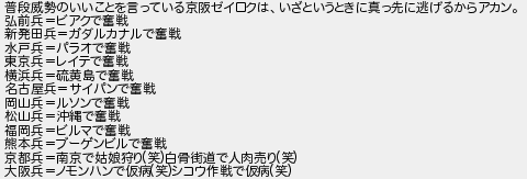 普段威勢のいいことを言っている京阪ゼイロクはいざというときに真っ先に逃げるからアカン 弘前兵ビアクで奮戦 新発田兵ガダルカナルで奮戦 水戸兵パラオで奮戦 東京兵レイテで奮戦 横浜兵硫黄島で奮戦 名古屋兵サイパンで奮戦 岡山兵ルソンで奮戦 松山兵沖縄で奮戦 福岡兵ビルマで奮戦 熊本兵ブーゲンビルで奮戦 京都兵南京で姑娘狩り笑白骨街道で人肉売り笑 大阪兵ノモンハンで仮病笑シコウ作戦で仮病笑