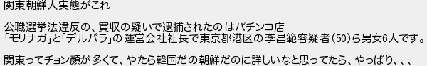 関東朝鮮人実態がこれ 公職選挙法違反の買収の疑いで逮捕されたのはパチンコ店 モリナガとデルパラの運営会社社長で東京都港区の李昌範容疑者ら男女人です 関東ってチョン顔が多くてやたら韓国だの朝鮮だのに詳しいなと思ってたらやっぱり