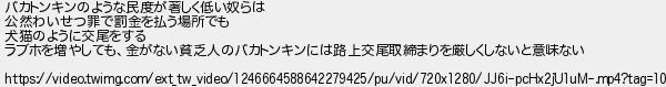 175: (やわらか銀行) [] 2026/02/12(木) 19:13:33.13 ID:EjHP4RwS バカトンキンのような民度が著しく低い奴らは 公然わいせつ罪で罰金を払う場所でも 犬猫のように交尾をする ラブホを増やしても、金がない貧乏人のバカトンキンには路上交尾取締まりを厳しくしないと意味ない https://video.twimg.com/ext_tw_video/1246664588642279425/pu/vid/720x1280/JJ6i-pcHx2jU1uM-.mp4?tag=10 http://egg.5ch.net/test/read.cgi/develop/1769856442/175