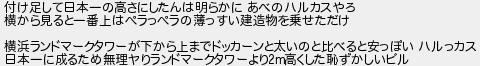 付け足して日本一の高さにしたんは明らかに あべのハルカスやろ 横から見ると一番上はペラっペラの薄っすい建造物を乗せただけ 横浜ランドマークタワーが下から上までドッカーンと太いのと比べると安っぽい ハルっカス 日本一に成るため無理ヤりランドマークタワーより高くした恥ずかしいビル