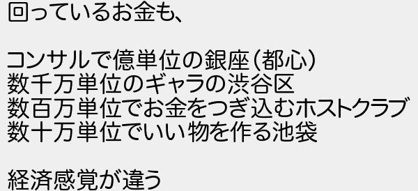 回っているお金も コンサルで億単位の銀座都心 数千万単位のギャラの渋谷区 数百万単位でお金をつぎ込むホストクラブ 数十万単位でいい物を作る池袋 経済感覚が違う