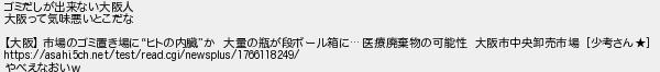 ゴミだしが出来ない大阪人 大阪って気味悪いとこだな 大阪 市場のゴミ置き場にヒトの内臓か 大量の瓶が段ボール箱に医療廃棄物の可能性 大阪市中央卸売市場 少考さん やべえなおい