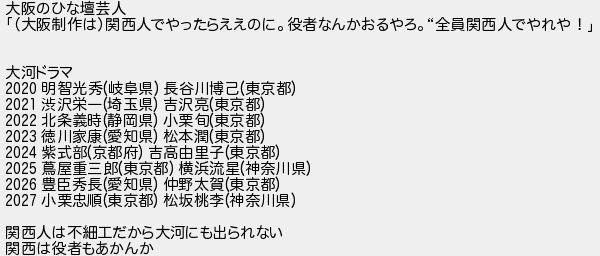 49: (ジパング) [] 2025/12/01(月) 18:08:15.90 ID:vqr3wOzb 大阪のひな壇芸人 「(大阪制作は)関西人でやったらええのに。役者なんかおるやろ。“全員関西人でやれや!」 大河ドラマ 2020 明智光秀(岐阜県) 長谷川博己(東京都) 2021 渋沢栄一(埼玉県) 吉沢亮(東京都) 2022 北条義時(静岡県) 小栗旬(東京都) 2023 徳川家康(愛知県) 松本潤(東京都) 2024 紫式部(京都府) 吉高由里子(東京都) 2025 蔦屋重三郎(東京都) 横浜流星(神奈川県) 2026 豊臣秀長(愛知県) 仲野太賀(東京都) 2027 小栗忠順(東京都) 松坂桃李(神奈川県) 関西人は不細工だから大河にも出られない 関西は役者もあかんか http://egg.5ch.net/test/read.cgi/develop/1756856086/49
