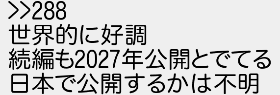 290: [sage] 2025/09/09(火) 00:37:22.70 ID:n0K5a/1d >>288 世界的に好調 続編も2027年公開とでてる 日本で公開するかは不明 http://lavender.5ch.net/test/read.cgi/cinema/1753640407/290