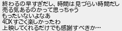 終わるの早すぎだし時間は見づらい時間だし 売る気あるのかって思っちゃう もったいないよなあ すごく楽しかったわ 上映してくれるだけでも感謝すべきか