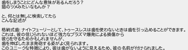 歯をしまうことにどんな意味があるんだろう? 猫のツメみたいなもんか? と何とは無しに検索してたら こんな記述が 格納式歯 ナイトフューリーとしてトゥースレスは歯を使わないときは歯を引っ込めることができます これは彼の信じられないほど強力なプラズマ爆発による損傷から 彼らを守るためかもしれませんが 歯を伸ばしたまま発砲する姿がよく見られます このユニークな特徴により彼は歯がないように見えるため彼の名前が付けられました