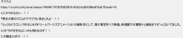 623: [] 2025/09/16(火) 02:10:03.42 ID:vqe9SNph オススメ https://x.com/yu04_movie/status/1966881747267936339?t=3rQUuDqBXG9NatFBwE1Rzw&s=19 ところでみなさん…!! 『野生の島のロズ』がアマプラに来ましたよ…!! 「ヒックとドラゴン」でおなじみのドリームワークスアニメーションの最新作にして、僕の暫定年ベス映画。映画館では冒頭から最後までずっと泣いてました。 ヒクドラが好きならこっちも刺さるはず!! この機会にぜひ…!! http://lavender.5ch.net/test/read.cgi/cinema/1753640407/623