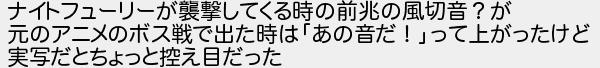 ナイトフューリーが襲撃してくる時の前兆の風切音?が 元のアニメのボス戦で出た時はあの音だ!って上がったけど 実写だとちょっと控え目だった