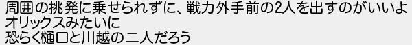 周囲の挑発に乗せられずに戦力外手前の人を出すのがいいよ オリックスみたいに 恐らく樋口と川越の二人だろう