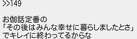 150: [] 2025/09/07(日) 11:48:12.06 ID:8G4Jb5tB >>149 お伽話定番の 「その後はみんな幸せに暮らしましたとさ」 でキレイに終わってるからな http://lavender.5ch.net/test/read.cgi/cinema/1753640407/150
