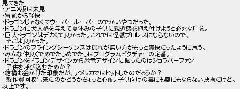 見てきた アニメ版は未見 冒頭から軽快 ドラゴンじゃなくてウーパールーパーのでかいやつだった ドラゴンに犬人格を与えて夏休みの子供に親近感を植え付けようと必死な印象 巨大ドラゴンはデカくて良かったこれでは怪獣プロレスにならないので そこは良かった ドラゴンのフライングシーケンスは揺れが無い方がもっと爽快だったように思う みんな仲良くでめでたしめでたしはプログラムピクチャーの定番 ドラゴンをドラゴンデザインから恐竜デザインに振ったのはジョラパーファン 子供を呼び込むためか? 結構お金かけた印象だがアメリカではヒットしたのだろうか? 製作費回収出来たのかどうかちょっと心配子供向けの毒にも薬にもならない映画だけど 以上です