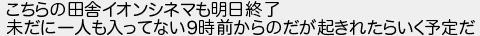 こちらの田舎イオンシネマも明日終了 未だに一人も入ってない9時前からのだが起きれたらいく予定だ