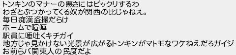トンキンのマナーの悪さにはビックリするわ わざとぶつかってくる奴が関西の比じゃねえ 毎日痴漢盗撮だらけ ホームで喧嘩 駅員に唾吐くキチガイ 地方じゃ見かけない光景が広がるトンキンがマトモなワケねえだろガイジ お前らバ関東人の民度だよ
