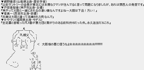 4: (ジパング) [] 2026/03/22(日) 08:37:08.24 ID:feMMKysr ▼網野善彦(山梨県出身・歴史学者) 『以前サントリーの会長が東北には未開なクマソが住んでると言って問題になりましたが、あれは関西人の発想です』 ▼戸田恵梨香(神戸市出身・女優) 『神戸って大阪と一緒にされるの凄い嫌なんですよね~大阪は下品!汚い!』 ▼堤真一(西宮市出身・俳優) 『兵庫は大阪と違って洗練された町なんで』 ▼かやマン(福岡県出身・モデル) 『金足農と昔戦ったPL4番が暴力団と繋がりのある前科持ちだった件。永久追放だろこれ』 ___¶___ /| |\ / / PL親父 \ 丶 | / へ へ ヽ | (|─[ ‐ ]ー[ ‐ ]─|ノ | ノし (、_, )、 | < 大阪様の悪口言うなよおおおおおおおおお!!!!!!!!!!!!! | ⌒ ),r=‐、( | \ ー / ./ ヽl!| ! / \ |i / ヽ !l ヽi ( 丶- 、 しE |そ `ー、_ノ l、E ノ < レY^V^ヽl http://egg.5ch.io/test/read.cgi/develop/1774041349/4