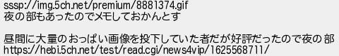 51: [sage] 2021/07/10(土) 07:08:30.06 ID:OgdbUlqF sssp://img.5ch.net/premium/8881374.gif 夜の部もあったのでメモしておかんとす 昼間に大量のおっぱい画像を投下していた者だが好評だったので夜の部 https://hebi.5ch.net/test/read.cgi/news4vip/1625568711/ http://pug.5ch.net/test/read.cgi/diary/1583662300/51