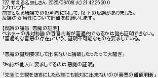 6: [] 2025/09/13(土) 15:49:38.54 ID:0 727 考える名無しさん 2025/09/09(火) 21:42:25.30 0 >プロンプト 前提となる議論での批判者に対して、以下の反論がありました。 反論の妥当性について評価をお願いします。 【反論の論旨:悪魔の証明】 ベネターの非対称論の価値判断が普遍的であるかは誰も証明できない。 「普遍的な善悪の存在」という、証明不可能なものを要求している。 「悪魔の証明要求して出来ないと論破したったって大騒ぎ」 「お前が他人に要求してるのは悪魔の証明」 「完全に主観を抜きにしたら誰にも絶対に出来ないのが善悪の価値判断」 http://lavender.5ch.net/test/read.cgi/philo/1757745847/6