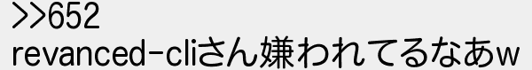 653: [sage] 2022/09/17(土) 21:43:41.03 ID:KgXphTBE >>652 revanced-cliさん嫌われてるなあw http://egg.5ch.net/test/read.cgi/android/1661527900/653