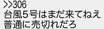 309: [sage] 2024/08/10(土) 17:39:58.84 >>306 台風5号はまだ来てねえ 普通に売切れだろ http://egg.5ch.net/test/read.cgi/atom/1663644331/309