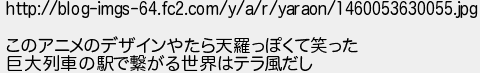 56: [sage] 2016/04/10(日) 11:12:46.23 ID:??? http://blog-imgs-64.fc2.com/y/a/r/yaraon/1460053630055.jpg このアニメのデザインやたら天羅っぽくて笑った 巨大列車の駅で繋がる世界はテラ風だし http://medaka.5ch.net/test/read.cgi/cgame/1373806387/56
