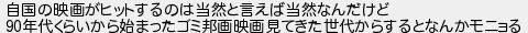 自国の映画がヒットするのは当然と言えば当然なんだけど 年代くらいから始まったゴミ邦画映画見てきた世代からするとなんかモニョる