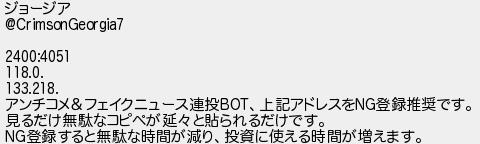 ジョージア アンチコメフェイクニュース連投上記アドレスを登録推奨です 見るだけ無駄なコピペが延と貼られるだけです 登録すると無駄な時間が減り投資に使える時間が増えます