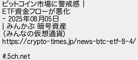 6: (スフッ Sd2f-UhpS) [] 2025/08/05(火) 20:31:03.86 ID:DW2CMvVDd ビットコイン市場に警戒感| ETF資金フローが悪化 - 2025年08月05日 | みんかぶ 暗号資産 (みんなの仮想通貨) https://crypto-times.jp/news-btc-etf-8-4/ #.5ch.net http://fate.5ch.net/test/read.cgi/cryptocoin/1754380732/6
