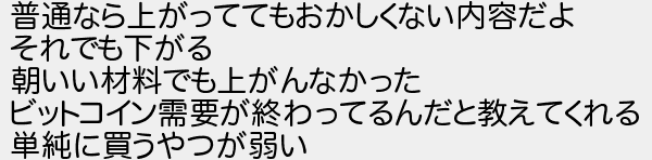 普通なら上がっててもおかしくない内容だよ それでも下がる 朝いい材料でも上がんなかった ビットコイン需要が終わってるんだと教えてくれる 単純に買うやつが弱い
