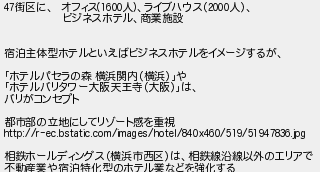 271: (神奈川県) [sage] 2017/04/18(火) 19:08:23.11 ID:iOa2Cg83 47街区に、 オフィス(1600人)、ライブハウス(2000人)、 ビジネスホテル、商業施設 宿泊主体型ホテルといえばビジネスホテルをイメージするが、 「ホテルパセラの森 横浜関内(横浜)」や 「ホテルバリタワー大阪天王寺(大阪)」は、 バリがコンセプト 都市部の立地にしてリゾート感を重視 http://r-ec.bstatic.com/images/hotel/840x460/519/51947836.jpg 相鉄ホールディングス(横浜市西区)は、相鉄線沿線以外のエリアで 不動産業や宿泊特化型のホテル業などを強化する http://egg.5ch.net/test/read.cgi/develop/1491584313/271