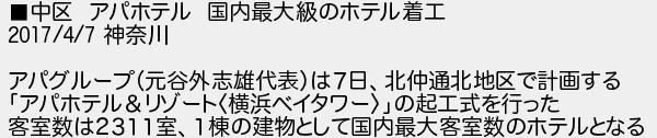 5: (神奈川県) [sage] 2017/04/08(土) 02:09:12.83 ID:DAkLei/g ■中区 アパホテル 国内最大級のホテル着工 2017/4/7 神奈川 アパグループ(元谷外志雄代表)は7日、北仲通北地区で計画する 「アパホテル&リゾート〈横浜ベイタワー〉」の起工式を行った 客室数は2311室、1棟の建物として国内最大客室数のホテルとなる http://egg.5ch.net/test/read.cgi/develop/1491584313/5