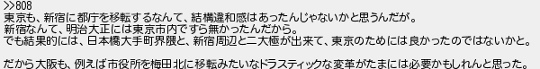 東京も新宿に都庁を移転するなんて結構違和感はあったんじゃないかと思うんだが 新宿なんて明治大正には東京市内ですら無かったんだから でも結果的には日本橋大手町界隈と新宿周辺と二大極が出来て東京のためには良かったのではないかと だから大阪も例えば市役所を梅田北に移転みたいなドラスティックな変革がたまには必要かもしれんと思った