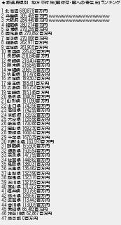 都道府県別 地方交付税国依存国への寄生虫ランキング 北海道 百万円 兵庫県 百万円 大阪府 百万円 福岡県 百万円 新潟県 百万円 鹿児島県 百万円 岩手県 百万円 福島県 百万円 宮城県 百万円 青森県 百万円 長野県 百万円 長崎県 百万円 熊本県 百万円 沖縄県 百万円 秋田県 百万円 茨城県 百万円 埼玉県 百万円 広島県 百万円 宮崎県 百万円 島根県 百万円 山形県 百万円 山口県 百万円 高知県 百万円 京都府 百万円 大分県 百万円 岐阜県 百万円 岡山県 百万円 愛媛県 百万円 千葉県 百万円 和歌山県 百万円 静岡県 百万円 徳島県 百万円 奈良県 百万円 佐賀県 百万円 鳥取県 百万円 三重県 百万円 山梨県 百万円 群馬県 百万円 石川県 百万円 富山県 百万円 福井県 百万円 栃木県 百万円 滋賀県 百万円 香川県 百万円 愛知県 百万円 神奈川県 百万円 東京都 百万円