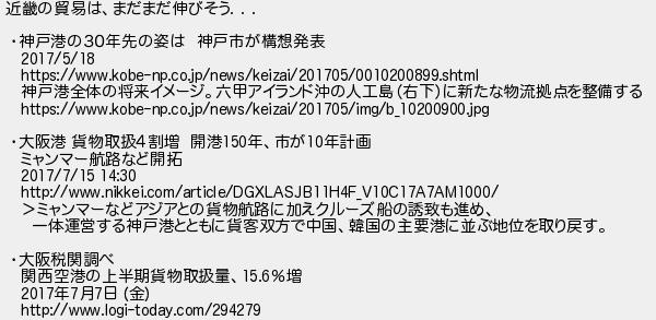 20: (茸) [] 2017/08/04(金) 19:41:57.61 ID:2lRCYmvh 近畿の貿易は、まだまだ伸びそう... ・神戸港の30年先の姿は 神戸市が構想発表 2017/5/18 https://www.kobe-np.co.jp/news/keizai/201705/0010200899.shtml 神戸港全体の将来イメージ。六甲アイランド沖の人工島(右下)に新たな物流拠点を整備する https://www.kobe-np.co.jp/news/keizai/201705/img/b_10200900.jpg ・大阪港 貨物取扱4割増 開港150年、市が10年計画 ミャンマー航路など開拓 2017/7/15 14:30 http://www.nikkei.com/article/DGXLASJB11H4F_V10C17A7AM1000/ >ミャンマーなどアジアとの貨物航路に加えクルーズ船の誘致も進め、 一体運営する神戸港とともに貨客双方で中国、韓国の主要港に並ぶ地位を取り戻す。 ・大阪税関調べ 関西空港の上半期貨物取扱量、15.6%増 2017年7月7日 (金) http://www.logi-today.com/294279 http://egg.5ch.net/test/read.cgi/develop/1501831768/20