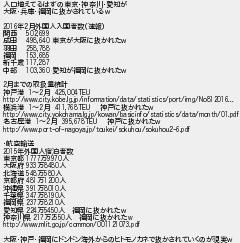 48: (空) [] 2017/08/04(金) 20:56:36.98 ID:I5ALEqIL 人口増えてるはずの東京・神奈川・愛知が 大阪・兵庫・福岡に抜かされているw 2016年2月外国人入国者数(速報) 関西 502,699 成田 498,640 東京が大阪に抜かれたw 羽田 258,788 福岡 153,685 新千歳 117,287 中部 103,360 愛知が福岡に抜かれたw 2月までの取扱量統計 神戸港 1〜2月 425,004TEU http://www.city.kobe.lg.jp/information/data/statistics/port/img/No812016... 横浜港 1〜2月 411,768TEU 神戸に抜かれたw http://www.city.yokohama.lg.jp/kowan/basicinfo/statistics/data/month/01.pdf 名古屋港 1〜2月 395,678TEU 神戸に抜かれたw http://www.port-of-nagoya.jp/toukei/sokuhou/sokuhou2-6.pdf ・航空輸送 2015年外国人宿泊者数 東京都 1777万9970人 大阪府 933万8480人 北海道 548万580人 京都府 481万1200人 沖縄県 391万8010人 千葉県 347万8190人 福岡県 237万8210人 愛知県 224万5450人 福岡に抜かれたw 神奈川県 217万2550人 福岡に抜かれたw http://www.mlit.go.jp/common/001121073.pdf 大阪・神戸・福岡にドンドン海外からのヒトモノカネで抜かされていくのが現実w http://egg.5ch.net/test/read.cgi/develop/1501831768/48