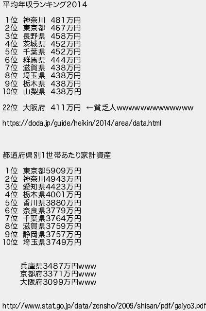 527: (芋) [] 2017/08/10(木) 18:12:51.48 ID:jK5qTp6d 平均年収ランキング2014 1位 神奈川 481万円 2位 東京都 467万円 3位 長野県 458万円 4位 茨城県 452万円 5位 千葉県 452万円 6位 群馬県 444万円 7位 滋賀県 438万円 8位 埼玉県 438万円 9位 栃木県 438万円 10位 山梨県 438万円 22位 大阪府 411万円 ←貧乏人wwwwwwwwwwwww https://doda.jp/guide/heikin/2014/area/data.html 都道府県別1世帯あたり家計資産 1位 東京都5909万円 2位 神奈川4943万円 3位 愛知県4423万円 4位 栃木県4001万円 5位 香川県3880万円 6位 奈良県3779万円 7位 千葉県3764万円 8位 滋賀県3759万円 9位 静岡県3757万円 10位 埼玉県3749万円 兵庫県3487万円www 京都府3371万円www 大阪府3099万円www http://www.stat.go.jp/data/zensho/2009/shisan/pdf/gaiyo3.pdf http://egg.5ch.net/test/read.cgi/develop/1501831768/527