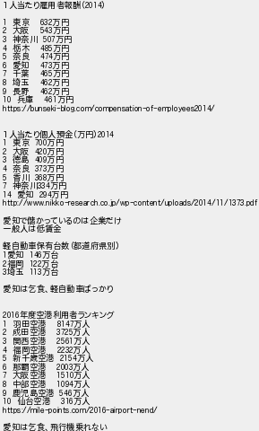 535: (dion軍) [] 2017/08/10(木) 18:53:25.61 ID:sVhI6uam 1人当たり雇用者報酬(2014) 1 東京 632万円 2 大阪 543万円 3 神奈川 507万円 4 栃木 485万円 5 奈良 474万円 6 愛知 473万円 7 千葉 465万円 8 埼玉 462万円 9 長野 462万円 10 兵庫 461万円 https://bunseki-blog.com/compensation-of-employees2014/ 1人当たり個人預金(万円)2014 1 東京 700万円 2 大阪 420万円 3 徳島 409万円 4 奈良 373万円 5 香川 368万円 7 神奈川334万円 14 愛知 294万円 http://www.nikko-research.co.jp/wp-content/uploads/2014/11/1373.pdf 愛知で儲かっているのは企業だけ 一般人は低賃金 軽自動車保有台数(都道府県別) 1愛知 146万台 2福岡 122万台 3埼玉 113万台 愛知は乞食、軽自動車ばっかり 2016年度空港利用者ランキング 1 羽田空港 8147万人 2 成田空港 3725万人 3 関西空港 2561万人 4 福岡空港 2232万人 5 新千歳空港 2154万人 6 那覇空港 2003万人 7 大阪空港 1510万人 8 中部空港 1094万人 9 鹿児島空港 546万人 10 仙台空港 316万人 https://mile-points.com/2016-airport-nend/ 愛知は乞食、飛行機乗れない http://egg.5ch.net/test/read.cgi/develop/1501831768/535