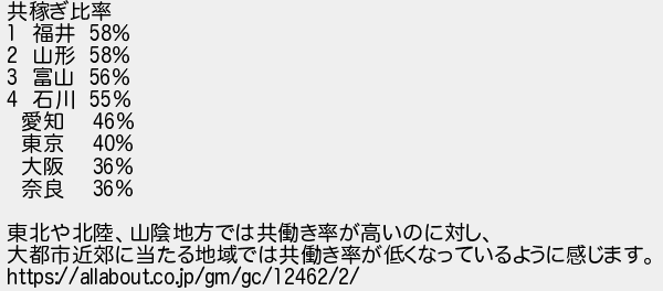 539: (dion軍) [] 2017/08/10(木) 19:13:53.83 ID:sVhI6uam 共稼ぎ比率 1 福井 58% 2 山形 58% 3 富山 56% 4 石川 55% 愛知 46% 東京 40% 大阪 36% 奈良 36% 東北や北陸、山陰地方では共働き率が高いのに対し、 大都市近郊に当たる地域では共働き率が低くなっているように感じます。 https://allabout.co.jp/gm/gc/12462/2/ http://egg.5ch.net/test/read.cgi/develop/1501831768/539