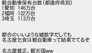 558: (dion軍) [] 2017/08/10(木) 19:22:02.34 ID:sVhI6uam 軽自動車保有台数(都道府県別) 1愛知 146万台 2福岡 122万台 3埼玉 113万台 都合のいいような嘘数字だしても 名古屋乞食は軽自動車って結果でてるぞ 名古屋貧乏、軽天国ww http://egg.5ch.net/test/read.cgi/develop/1501831768/558
