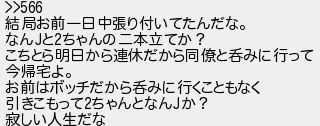 結局お前一日中張り付いてたんだな なんとちゃんの二本立てか? こちとら明日から連休だから同僚と呑みに行って 今帰宅よ お前はボッチだから呑みに行くこともなく 引きこもってちゃんとなんか? 寂しい人生だな