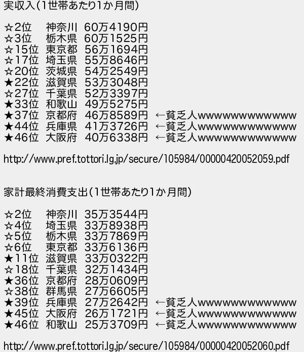 725: (芋) [] 2017/08/14(月) 17:48:11.92 ID:Nra/FBeN 実収入(1世帯あたり1か月間) ☆2位 神奈川 60万4190円 ☆3位 栃木県 60万1525円 ☆15位 東京都 56万1694円 ☆17位 埼玉県 55万8646円 ☆20位 茨城県 54万2549円 ★22位 滋賀県 53万3048円 ☆27位 千葉県 52万3397円 ★33位 和歌山 49万5275円 ★37位 京都府 46万8589円 ←貧乏人wwwwwwwwwwww ★44位 兵庫県 41万3726円 ←貧乏人wwwwwwwwwwww ★46位 大阪府 40万6338円 ←貧乏人wwwwwwwwwwww http://www.pref.tottori.lg.jp/secure/105984/00000420052059.pdf 家計最終消費支出(1世帯あたり1か月間) ☆2位 神奈川 35万3544円 ☆4位 埼玉県 33万8938円 ☆5位 栃木県 33万7869円 ☆6位 東京都 33万6136円 ★11位 滋賀県 33万0322円 ☆18位 千葉県 32万1434円 ★36位 京都府 28万0609円 ☆38位 群馬県 27万6605円 ★39位 兵庫県 27万2642円 ←貧乏人wwwwwwwwwwww ★45位 大阪府 26万1721円 ←貧乏人wwwwwwwwwwww ★46位 和歌山 25万3709円 ←貧乏人wwwwwwwwwwww http://www.pref.tottori.lg.jp/secure/105984/00000420052060.pdf http://egg.5ch.net/test/read.cgi/develop/1501831768/725