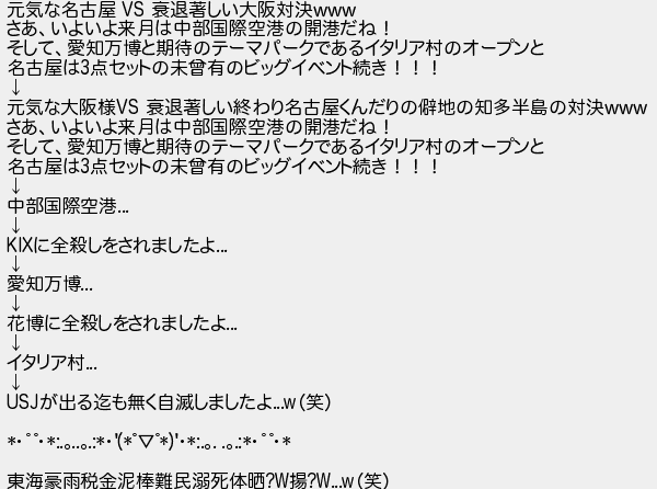 元気な名古屋 衰退著しい大阪対決 さあいよいよ来月は中部国際空港の開港だね! そして愛知万博と期待のテーマパークであるイタリア村のオープンと 名古屋は点セットの未曾有のビッグイベント続き!!! 元気な大阪様 衰退著しい終わり名古屋くんだりの僻地の知多半島の対決 さあいよいよ来月は中部国際空港の開港だね! そして愛知万博と期待のテーマパークであるイタリア村のオープンと 名古屋は点セットの未曾有のビッグイベント続き!!! 中部国際空港 に全殺しをされましたよ 愛知万博 花博に全殺しをされましたよ イタリア村 が出る迄も無く自滅しましたよ笑 東海豪雨税金泥棒難民溺死体晒揚笑