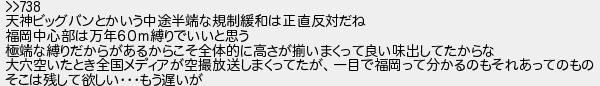 740: (福岡県) [sage] 2018/01/17(水) 23:42:41.30 ID:dlmN4mWF >>738 天神ビッグバンとかいう中途半端な規制緩和は正直反対だね 福岡中心部は万年60m縛りでいいと思う 極端な縛りだからがあるからこそ全体的に高さが揃いまくって良い味出してたからな 大穴空いたとき全国メディアが空撮放送しまくってたが、一目で福岡って分かるのもそれあってのもの そこは残して欲しい・・・もう遅いが http://egg.5ch.net/test/read.cgi/develop/1514891663/740
