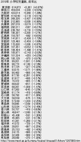 10: (岐阜県) [] 2019/10/05(土) 06:38:22.28 ID:Rv5AnC6B 2019年 小学校児童数、前年比 東京都 614,873 +5,361 (+0.87%) 神奈川 459,004 -2,300 (-0.50%) 大阪府 433,014 -5,960 (-1.38%) 愛知県 414,040 -2,119 (-0.51%) 埼玉県 369,326 -3,437 (-0.93%) 千葉県 312,865 -3,009 (-0.96%) 兵庫県 287,019 -3,074 (-1.07%) 福岡県 282,011 +587 (+0.21%) 北海道 239,792 -3,719 (-1.55%) 静岡県 190,301 -2,300 (-1.21%) 広島県 150,797 -982 (-0.65%) 茨城県 141,811 -2,436 (-1.72%) 京都府 123,493 -2,459 (-1.99%) 宮城県 115,630 -1,006 (-0.87%) 新潟県 107,351 -2,052 (-1.91%) 岐阜県 106,404 -1,498 (-1.41%) 長野県 105,871 -2,143 (-2.02%) 沖縄県 101,534 +255 (+0.25%) 岡山県 100,129 -970 (-0.97%) 栃木県 99,301 -1,631 (-1.64%) 群馬県 98,773 -2,149 (-2.18%) 熊本県 97,724 -227 (-0.23%) 三重県 93,515 -1,571 (-1.68%) 鹿児島 90,463 -666 (-0.74%) 福島県 87,730 -2,281 (-2.60%) 滋賀県 81,817 -466 (-0.57%) 長崎県 70,472 -805 (-1.14%) 愛媛県 68,622 -851 (-1.24%) 奈良県 68,361 -1,008 (-1.47%) 山口県 67,363 -845 (-1.25%) 宮崎県 61,174 -419 (-0.68%) 石川県 58,793 -817 (-1.39%) 大分県 58,558 -675 (-1.15%) 岩手県 57,949 -1,304 (-2.25%) 青森県 56,885 -1,509 (-2.65%) 山形県 52,034 -1,274 (-2.45%) 香川県 50,707 -419 (-0.83%) 富山県 49,847 -1,060 (-2.13%) 和歌山 45,438 -591 (-1.30%) 佐賀県 45,085 -331 (-0.73%) 秋田県 41,381 -1,289 (-3.11%) 福井県 41,072 -729 (-1.77%) 山梨県 39,951 -897 (-2.25%) 徳島県 35,153 -492 (-1.40%) 島根県 34,115 -686 (-2.01%) 高知県 32,428 -699 (-2.16%) 鳥取県 28,569 -370 (-1.30%) http://www.mext.go.jp/b_menu/toukei/chousa01/kihon/1267995.htm http://egg.5ch.net/test/read.cgi/develop/1570201166/10