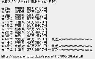 150: (SB-Android) [] 2019/10/06(日) 17:46:06.04 ID:3FaxK4KB 実収入2018年(1世帯あたり1か月間) ☆2位 茨城県 62万8154円 ☆3位 埼玉県 62万4099円 ☆8位 東京都 59万3036円 ★12位 滋賀県 57万7561円 ☆13位 千葉県 56万6978円 ☆16位 神奈川 55万8407円 ☆19位 栃木県 55万7286円 ★20位 奈良県 55万4807円 ★36位 和歌山 48万7512円 ★40位 大阪府 46万1993円 ←貧乏人wwwwwwwwwwww ☆44位 群馬県 43万2604円 ★45位 京都府 43万2391円 ←貧乏人wwwwwwwwwwww ★47位 兵庫県 37万5847円 ←貧乏人wwwwwwwwwwww https://www.pref.tottori.lg.jp/secure/1157846/08kakei.pdf http://egg.5ch.net/test/read.cgi/develop/1570201166/150