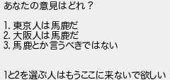あなたの意見はどれ? 東京人は馬鹿だ 大阪人は馬鹿だ 馬鹿とか言うべきではない とを選ぶ人はもうここに来ないで欲しい