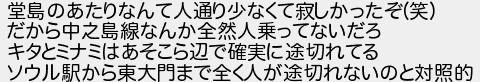 堂島のあたりなんて人通り少なくて寂しかったぞ笑 だから中之島線なんか全然人乗ってないだろ キタとミナミはあそこら辺で確実に途切れてる ソウル駅から東大門まで全く人が途切れないのと対照的