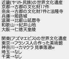 近畿ヤマト民族の世界文化遺産 京都古都の文化財件 奈良古都の文化財件と法隆寺 兵庫姫路城 滋賀比叡山延暦寺 和歌山紀井山地 大阪仁徳天皇陵 関東アズマエビスの世界文化遺産 東京フランス人の作った美術館 神奈川カマクラ 見事落選 埼玉なし 千葉なし