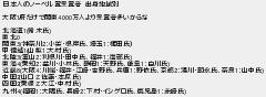 460: (大阪府) [sage] 2020/03/22(日) 20:30:34.85 ID:EvTDcI+H 日本人のノーベル賞受賞者 出身地域別 大阪1府だけで関東4000万人より受賞者多いからな 北海道1(鈴木氏) 東北0 関東3(神奈川2:小柴・根岸氏、埼玉1:梶田氏) 甲信越1(山梨1:大村氏) 北陸3(富山2:利根川・田中氏、福井1:南部氏) 東海4(愛知2:益川・小林氏、静岡1:天野氏、岐阜1:白川氏) 近畿8(大阪4:川端・福井・江崎・吉野氏、兵庫1:野依氏、京都2:湯川・朝永氏、奈良1:山中氏) 中国2(山口2:佐藤・本庶氏) 四国2(愛媛2:大江・中村氏) 九州4(福岡1:大隅氏、長崎2:下村・イシグロ氏、鹿児島1:赤崎氏) http://egg.5ch.net/test/read.cgi/develop/1584462425/460