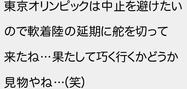 東京オリンピックは中止を避けたい ので軟着陸の延期に舵を切って 来たね果たして巧く行くかどうか 見物やね笑